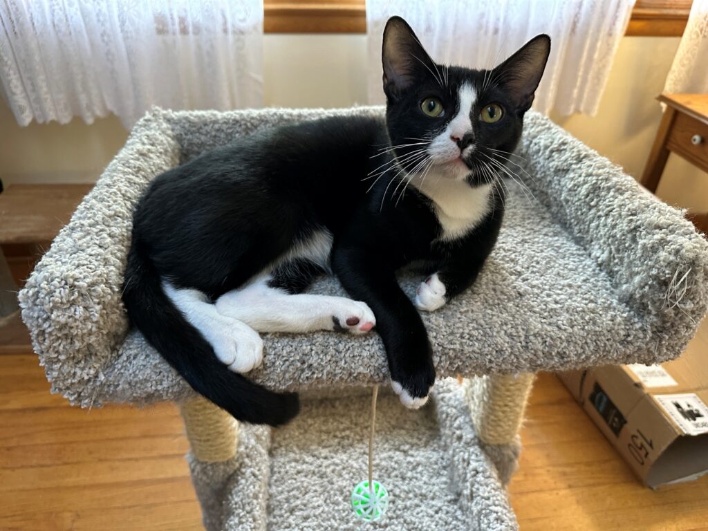 He loves to play with cat toys, especially the little spring toys and just like his littermates he likes playing with a whack-a-mole toy. Boxes to climb in are his favorite, too. He enjoys climbing up on a cat tree at the window to see whats happening outside. At his foster home he sees birds, fox, deer, and raccoons out pf the window.