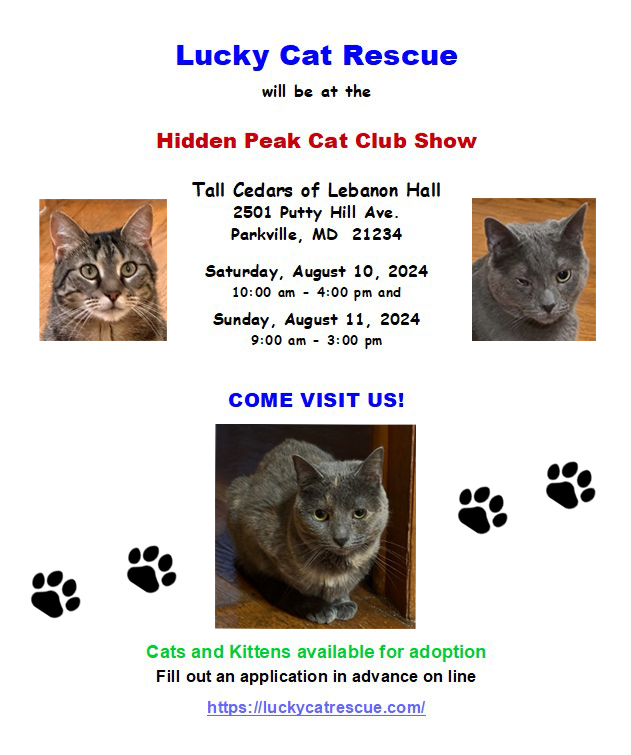 Cats and kittens are available for adoption by contacting us through our website https://luckycatrescue.com/